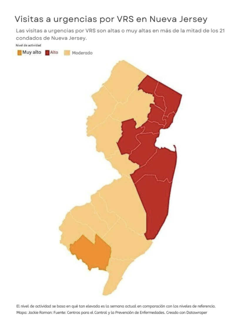 Los datos muestran que las visitas a urgencias y los ingresos hospitalarios por VRS han ido en aumento en Nueva Jersey desde principios de octubre. Actualmente, las visitas a urgencias por VRS son «altas» o «muy altas» en más de la mitad de los condados de Nueva Jersey.